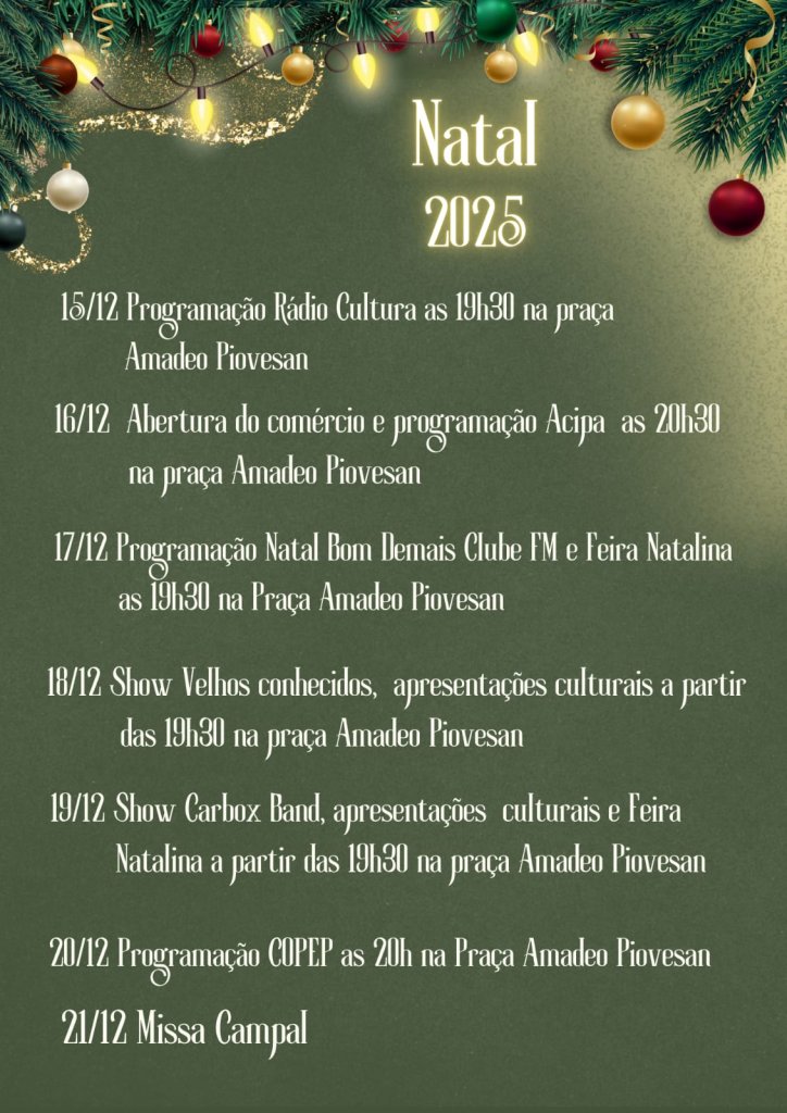 As comemorações tiveram início nesta terça-feira (2) e se estendem até o dia 23 de dezembro. Escolas, grupos artísticos, associações, emissoras de rádio e artistas locais estão envolvidos no evento, que tem como objetivo fortalecer o espírito natalino, promover a integração entre a comunidade e valorizar os talentos culturais da cidade.