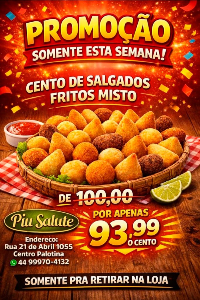 A Piu Salute de Palotina está com promoção especial até sexta-feira (16). O cento de salgados fritos mistos, que custava R$ 100,00, sai por apenas R$ 93,90 (promoção válida apenas para retirada no balcão).