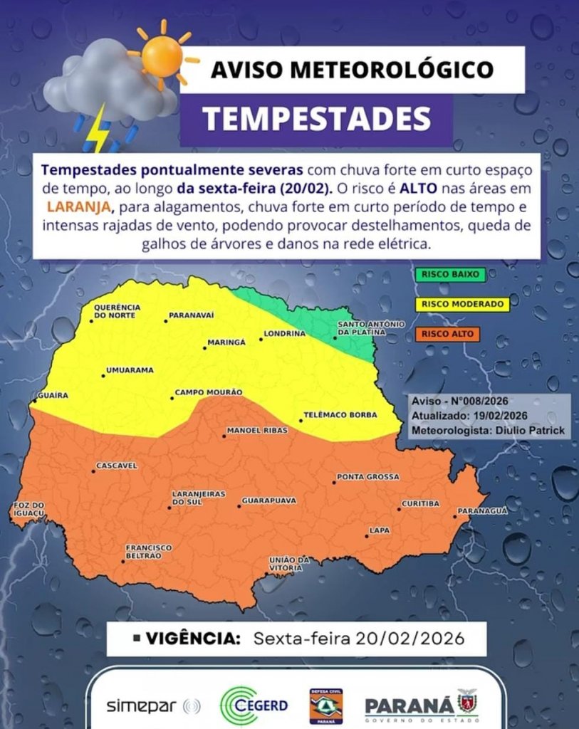 O Sistema de Tecnologia e Monitoramento Ambiental do Paraná (Simepar) emitiu aviso meteorológico para ocorrência de tempestades pontualmente severas ao longo desta sexta-feira (20/02/2026) em diversas regiões do Estado.