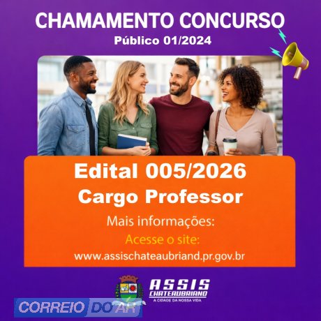 Publicado nesta segunda-feira (2), em diário oficial do município de Assis Chateaubriand, o edital 005/2026, tratando-se da trigésima quarta convocação de candidato habilitado no concurso público 01/2024, visando à nomeação no cargo de Professor. Os candidatos convocados devem entregar os documentos junto ao Recursos Humanos, entre os dias 2, 3, 4, 5 e 6 de fevereiro.