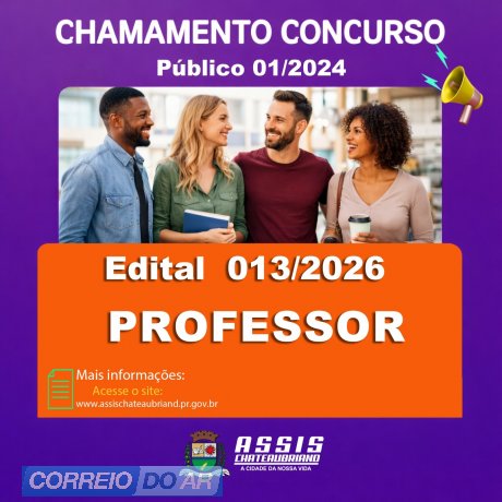 Publicado nesta segunda-feira (16), em diário oficial do município de Assis Chateaubriand, o edital 013/2026, tratando-se da trigésima sétima convocação de candidato habilitado no concurso público 01/2024, visando à nomeação no cargo de professor.