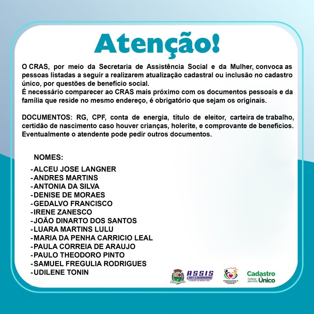 As pessoas convocadas devem comparecer ao CRAS mais próximo de sua residência, portando documentos pessoais e comprovante de residência