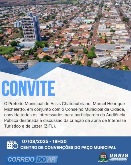 No próximo dia 7 de agosto, às 18h30, será realizada uma Audiência Pública no Centro de Convenções do Paço Municipal de Assis Chateaubriand. O evento tem como objetivo discutir a proposta de criação da Zona de Interesse Turístico e de Lazer no município, uma iniciativa que promete impulsionar o desenvolvimento local e atrair investimentos para a região. A Audiência Pública é uma oportunidade para que a comunidade, autoridades e especialistas possam debater os impactos e benefícios dessa nova zona, que visa fortalecer o turismo e ampliar as opções de lazer para moradores e visitantes.
