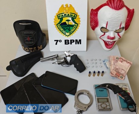 No local onde o suspeito foi encontrado, os policiais apreenderam a algema retirada, uma arma de fogo com munições, balanças de precisão, objetos diversos e uma quantia em dinheiro, reconhecida como sendo de posse do abordado.