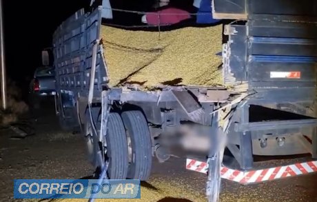 No caminhão atingido, a carroceria foi parcialmente quebrada, provocando a queda de uma parte da carga de grãos de milho.