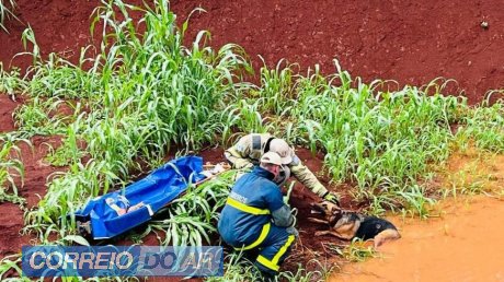 A ocorrência foi atendida pela equipe do ABTR (Auto Bomba Tanque e Resgate), que foi acionada para prestar socorro a uma cadela que estava caída em uma ribanceira, em um ponto de escoamento de água da chuva, próximo a um acúmulo formado recentemente.