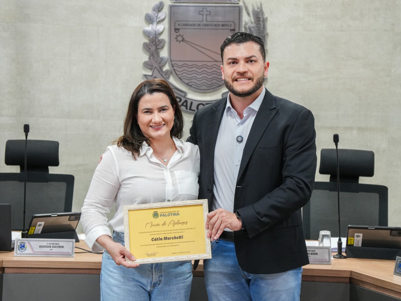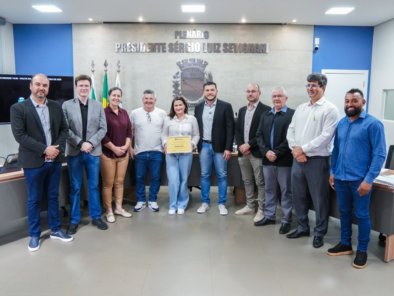 Na última sessão ordinária, realizada em 1º de setembro, a Câmara de Vereadores prestou uma homenagem à fisioterapeuta Cátia Marchetti, com a entrega de uma Moção de Aplausos em reconhecimento aos relevantes serviços prestados e à significativa contribuição para a área da saúde no município.