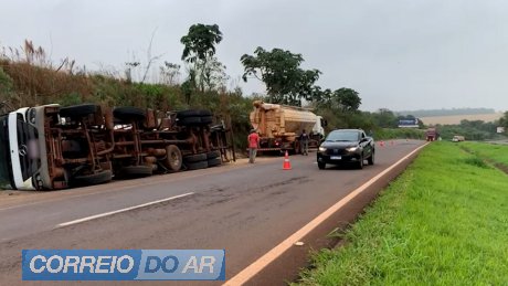 Caminhão carregado com 29 toneladas de ração tomba na BR-163 em Cascavel