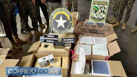 Durante a vistoria, os agentes identificaram um compartimento oculto no veículo, onde estavam diversas caixas com mercadorias introduzidas irregularmente no Brasil. Entre os itens apreendidos estão celulares e notebooks.