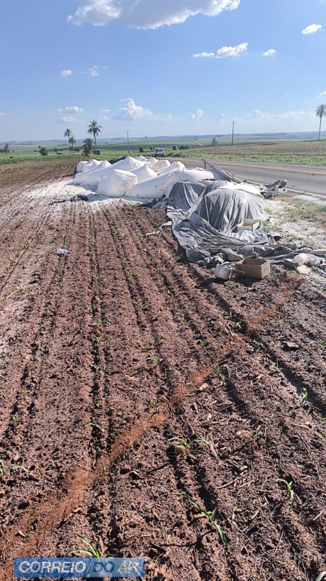 Segundo informações preliminares, o caminhão saiu da pista, e parte da carga acabou ficando espalhada pela via.