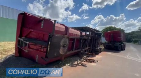 Carreta carregada com soja tomba após asfalto ceder em Umuarama
