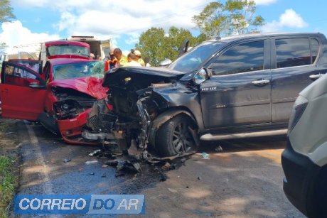 Uma colisão frontal envolvendo um automóvel e uma caminhonete deixou pelo menos quatro pessoas feridas no início da tarde desta terça-feira (24), na rodovia PR-493, no trecho conhecido como Serra do Lambedor, entre os municípios de Verê e Dois Vizinhos.