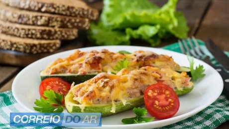 3. Abobrinha Recheada com Frango Desfiado e Legumes
