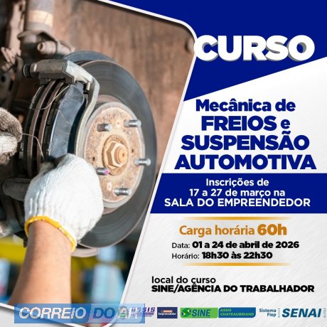 Continuam abertas as inscrições para o curso de Mecânica de Freios e Suspensão Automotiva e podem ser realizadas na Sala do Empreendedor até o dia 27 de março ou enquanto houver vagas disponíveis.