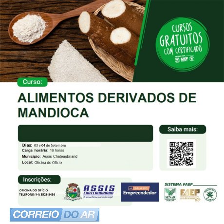 Estão abertas as inscrições para o Curso de Derivados de Mandioca, uma iniciativa que visa capacitar os interessados na produção e aproveitamento dos derivados deste importante alimento. O curso será realizado nos dias 3 e 4 de setembro e é oferecido gratuitamente graças à parceria entre o município de Assis Chateaubriand, a Secretaria de Assistência Social e da Mulher, a Sala do Empreendedor, o SENAR e o Sindicato Rural Patronal.