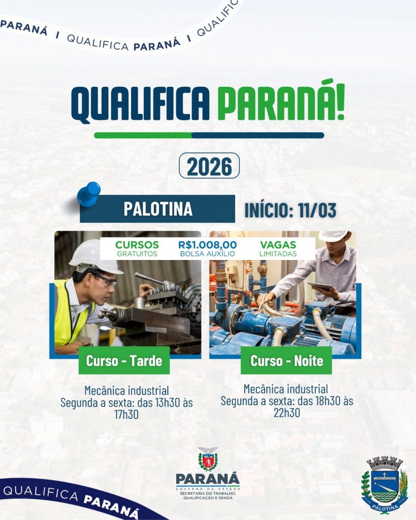 A Agência do Trabalhador de Palotina está com inscrições abertas para o curso de Mecânica Industrial, ofertado por meio do programa Qualifica Paraná. A capacitação terá início no próximo dia 11 e será realizada no município de Palotina.