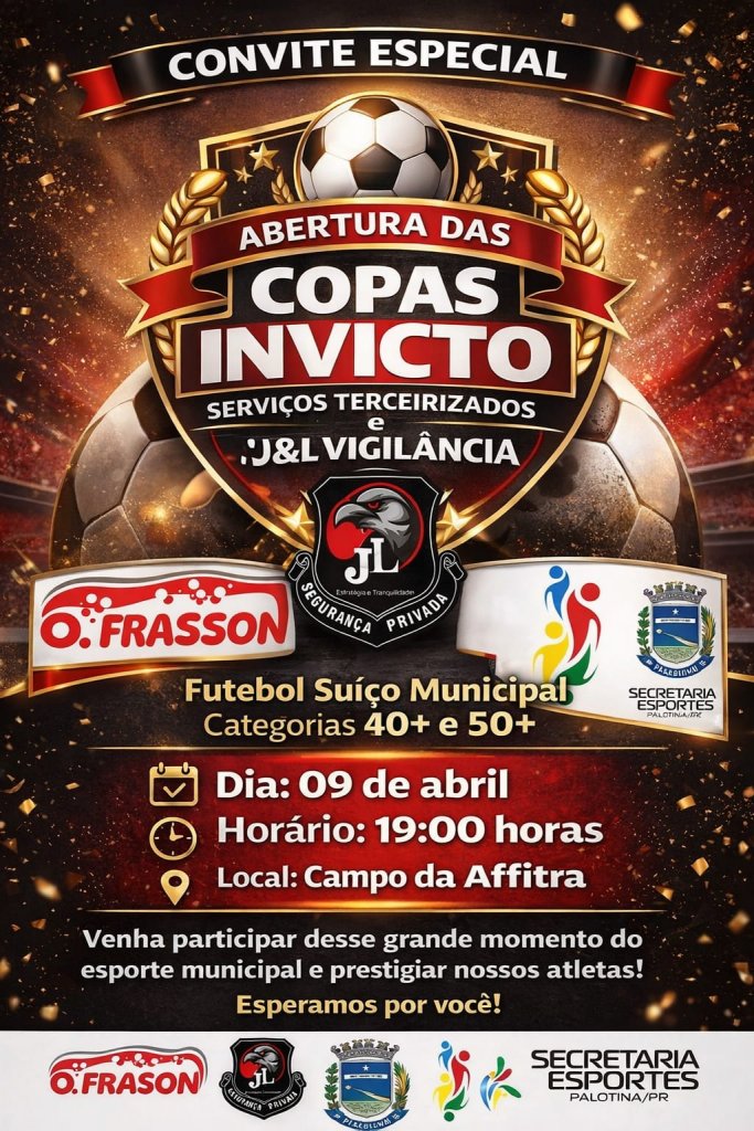 A primeira rodada da Copa Invicto Serviços Terceirizados e J&L Vigilância de Futebol Suíço Municipal Master, que inicia nesta quinta-feira (09), já tem seus confrontos definidos. As partidas prometem movimentar o cenário esportivo local, reunindo equipes nas categorias 40+ e 50+.