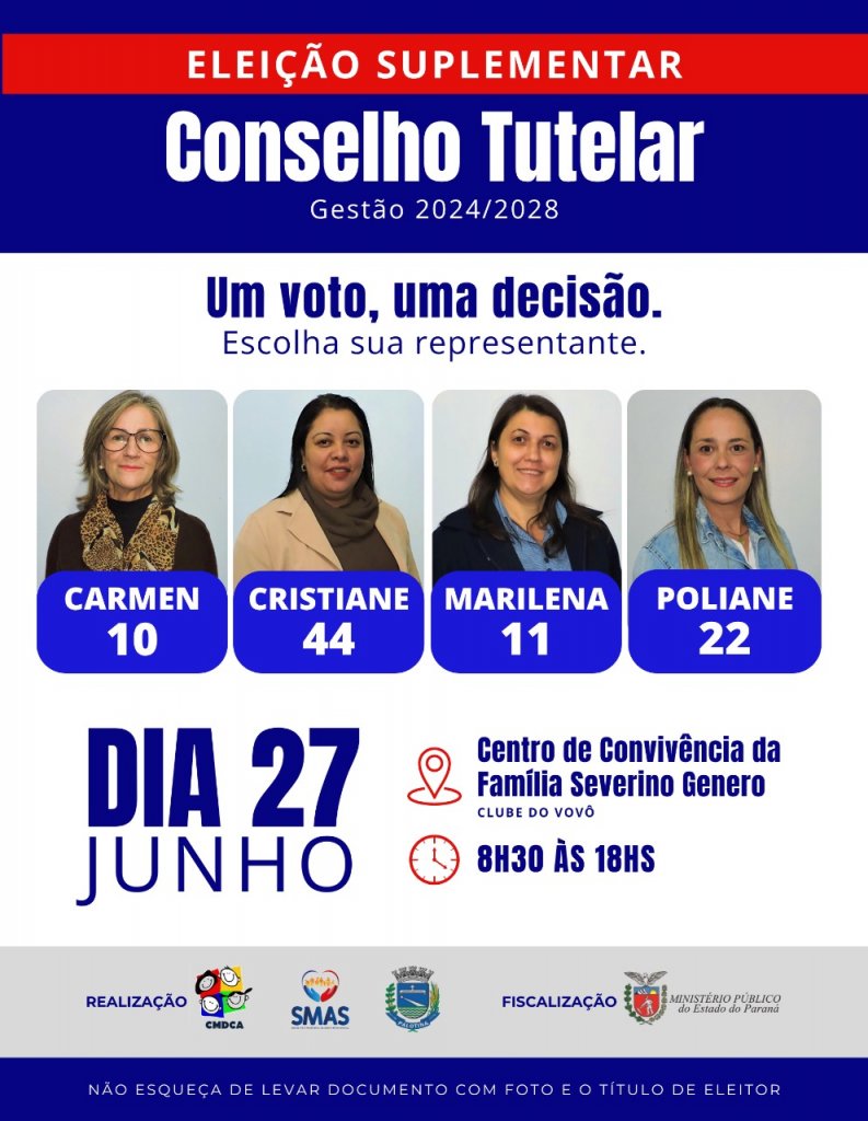 O Conselho Municipal dos Direitos da Criança e do Adolescente (CMDCA) realiza, nesta sexta-feira (27), a Eleição Suplementar para escolha de uma nova conselheira tutelar em Palotina. A votação ocorrerá das 8h30 às 18h, no Centro de Convivência da Família Vereador Severino Gênero (Clube do Vovô).