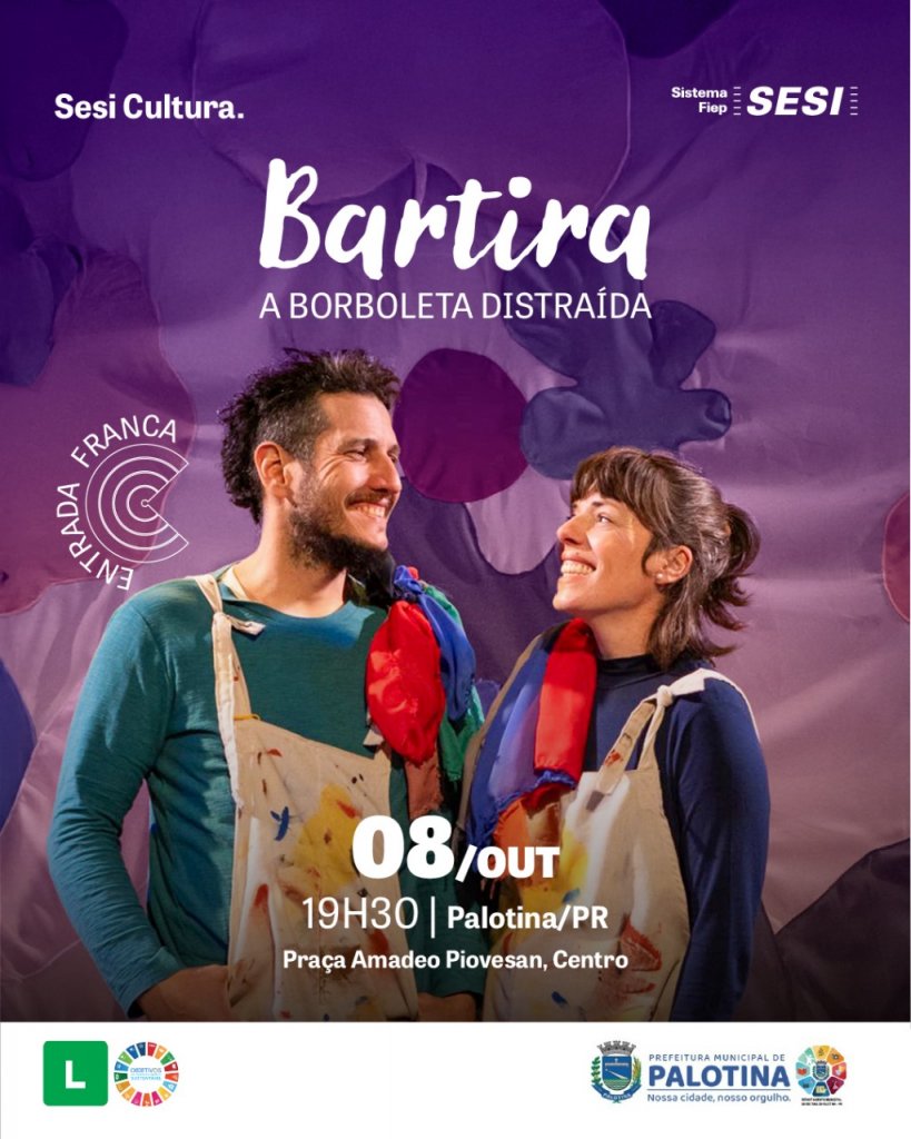 Realizada por meio de uma parceria entre o Sesi Cultura Paraná e a Prefeitura de Palotina, a atração promete envolver toda a família com uma história lúdica, colorida e cheia de ensinamentos. A peça acompanha Bartira, uma simpática borboleta que vive grandes aventuras em meio à natureza, enquanto descobre o valor da amizade, do cuidado com o meio ambiente e da atenção ao momento presente.