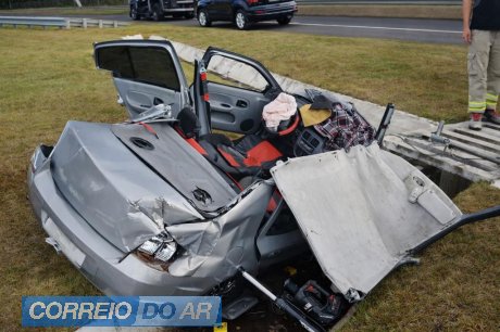 Um grave acidente de trânsito envolvendo um Renault Clio foi registrado no Trevo Cataratas, em Cascavel, na tarde deste domingo (22).
