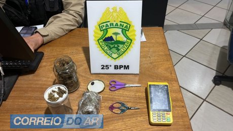 Após acompanhamento tático, os policiais conseguiram interceptar o motociclista. Durante a revista pessoal e na mochila que ele carregava, foram encontrados dois potes de vidro contendo porções de “flor de maconha”, além de haxixe, duas tesouras e uma máquina de cartão de crédito, item comumente associado à comercialização de entorpecentes.