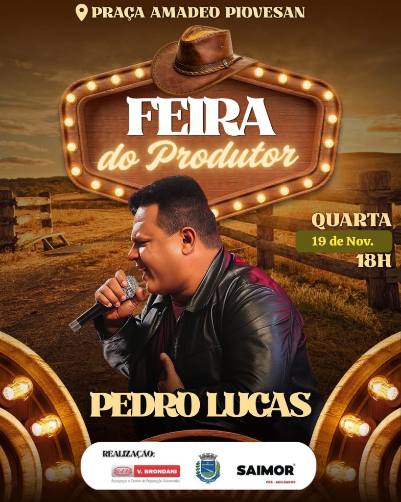A Prefeitura Municipal de Palotina, por meio da Secretaria do Agronegócio e em parceria com V. Bondani, Saimor Pré-moldados e a Feira do Produtor, realiza nesta quarta-feira (19) um show ao vivo com Pedro Lucas, na Praça Amadeo Piovesan.