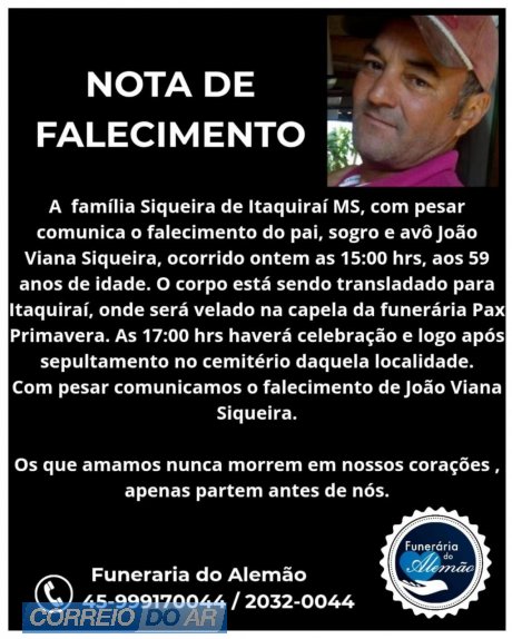 Segundo nota divulgada pela família, o corpo de João está sendo transladado para Itaquiraí, no Mato Grosso do Sul, onde será velado na capela da funerária Pax Primavera. A celebração de despedida está marcada para as 17h, seguida do sepultamento no cemitério local.