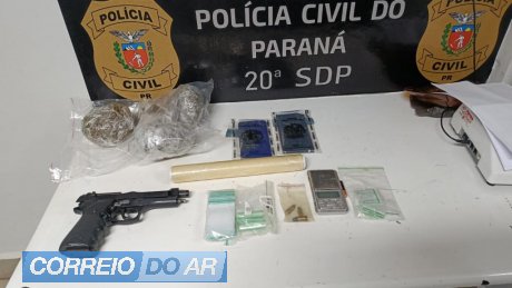 O indivíduo foi preso em flagrante pelos crimes de Tráfico de Drogas e Posse Irregular de Arma de Fogo, se encontra na Cadeia Pública local à disposição da Justiça Criminal da Comarca.