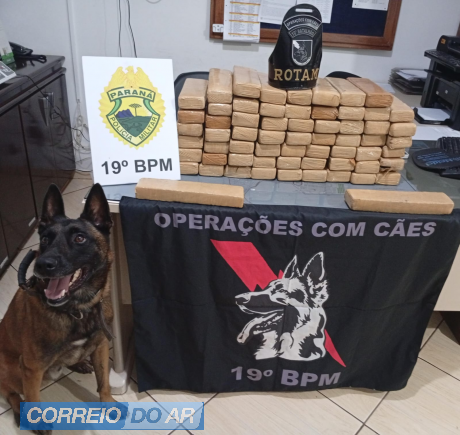 Com apoio da equipe ROTAM - Operações com Cães do 19º Batalhão da Polícia Militar, foi empregado o K9 Zeus, cão farejador certificado pela PMPR, que durante buscas na parte externa indicou para presença de entorpecente na fresta da porta.