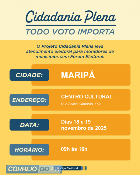 O município de Maripá vai receber nos dias 18 e 19 de novembro de 2025 o projeto Cidadania Plena – Todo Voto Importa, promovido pelo Tribunal Regional Eleitoral do Paraná (TRE-PR), por meio da 124ª Zona Eleitoral de Palotina. O atendimento será realizado no Centro Cultural, localizado na Rua Felipe Camarão, 162, das 9h às 16h.