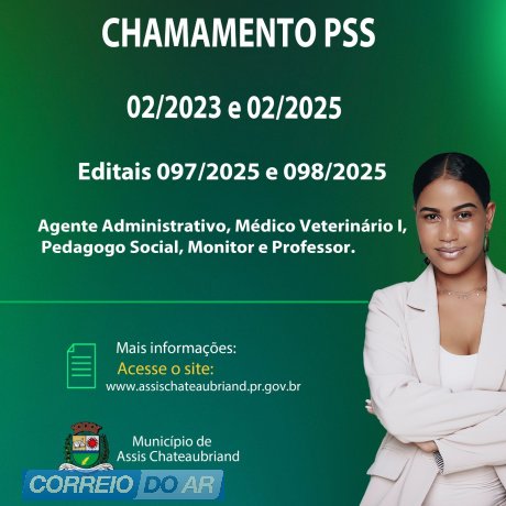 O município de Assis Chateaubriand publicou nesta segunda-feira (28) a convocação de candidatos aprovados em Processos Seletivos Simplificados (PSS) para os cargos de Monitor, Professor, Agente Administrativo, Médico Veterinário I  e Pedagogo Social.