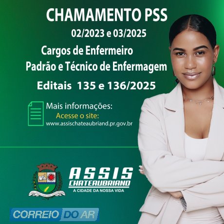 O município de Assis Chateaubriand publicou nesta terça-feira (25) a convocação de candidatos aprovados em Processos Seletivos Simplificados (PSS) para os cargos de Enfermeiro Padrão e Técnico de Enfermagem. Os editais PSS nº 135 e 136/2025 publicados no diário oficial, referem-se à 8ª convocação do PSS 03/2025 e a 77ª do PSS 02/2023