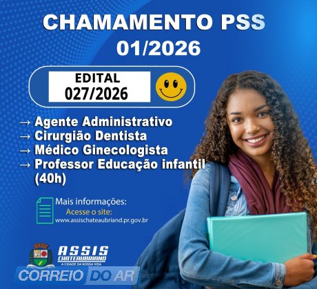 O município de Assis Chateaubriand publicou nesta terça-feira (17) a convocação de candidatos aprovados no Processo Seletivo Simplificado (PSS) para os cargos de Agente Administrativo, Cirurgião Dentista, Médico Ginecologista e Professor de Educação infantil PSS (40h). O edital PSS nº 027/2026 publicado no diário oficial, refere-se à 2ª convocação do PSS 01/2026.