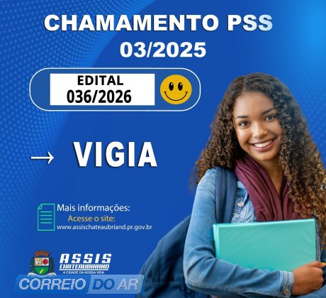 O município de Assis Chateaubriand publicou nesta segunda-feira (30) a convocação de candidato aprovado no Processo Seletivo Simplificado (PSS) para o cargo de Vigia. O edital PSS nº 036/2026 publicado no diário oficial, refere-se à 20ª convocação do PSS 03/2025.