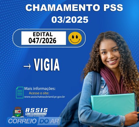 O município de Assis Chateaubriand publicou nesta terça-feira (28) a convocação de candidatos aprovados no Processo Seletivo Simplificado (PSS) para o cargo de Vigia. O edital PSS nº 047/2026 publicado no diário oficial, refere-se à 24ª convocação do PSS 03/2025.