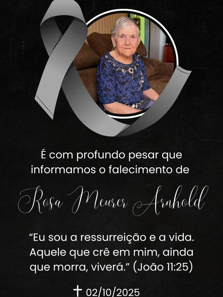 A Funerária Santa Rosa comunica com pesar o falecimento de Rosa Meurer Arnhold, ocorrido aos 90 anos de idade.
