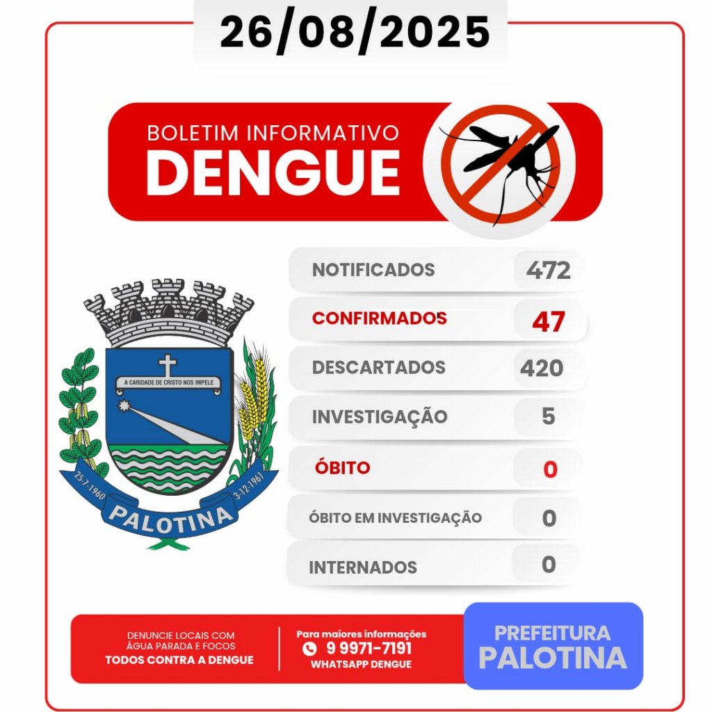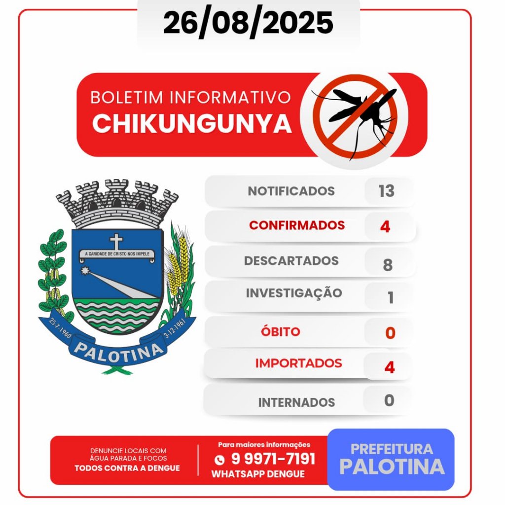 A Prefeitura de Palotina, por meio da Secretaria Municipal de Saúde, divulgou nesta terça-feira (26) os novos boletins informativos sobre os casos de Dengue e Chikungunya no município. Os dados fazem parte do trabalho de vigilância epidemiológica e reforçam o alerta para a necessidade de prevenção contínua.