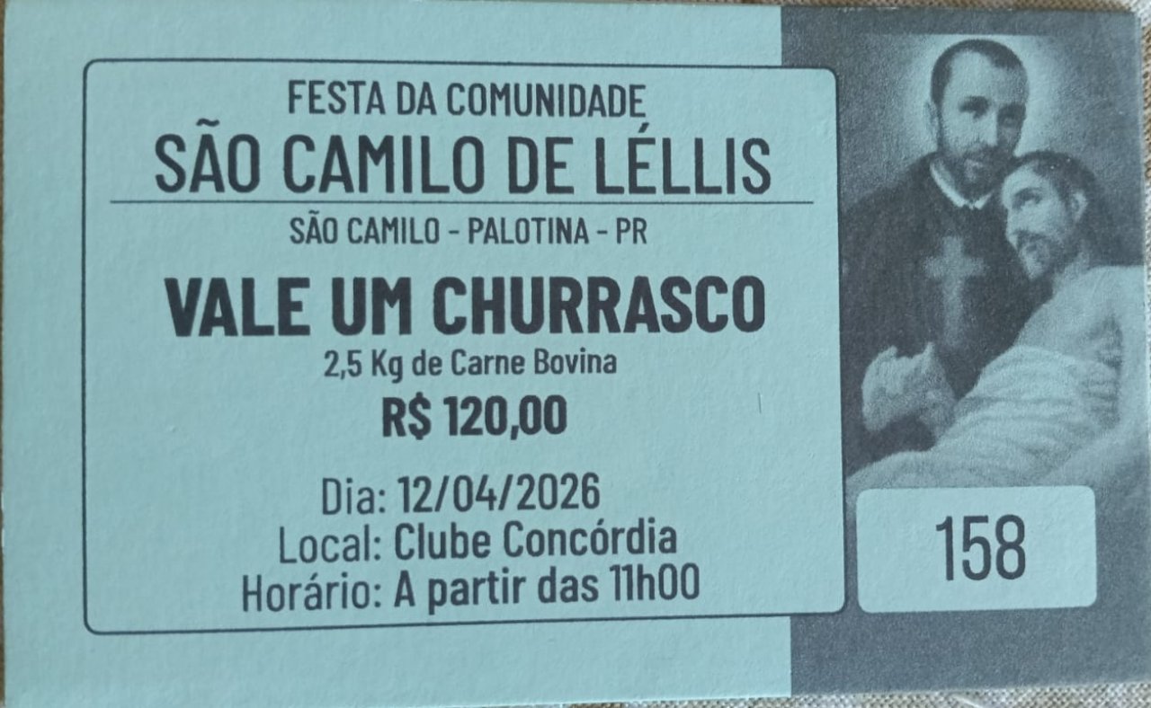 A tradicional Festa em Honra a São Camilo de Léllis será realizada no dia 12 de abril de 2026, no Clube Concórdia, reunindo programação religiosa e atividades festivas ao longo do dia.