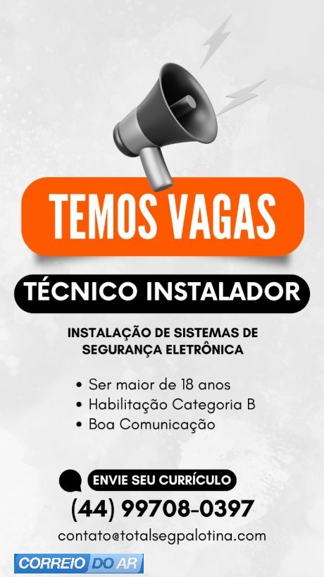 A empresa Total Seg de Palotina está com vaga para técnico instalador de sistemas de segurança eletrônica.