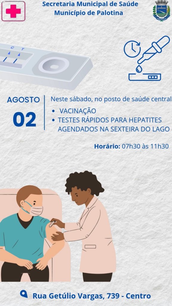 A Secretaria Municipal de Saúde de Palotina realizará, neste sábado (2), uma ação especial no Posto de Saúde Central, com foco em vacinação e prevenção às hepatites virais. O atendimento acontecerá das 7h30 às 11h30.