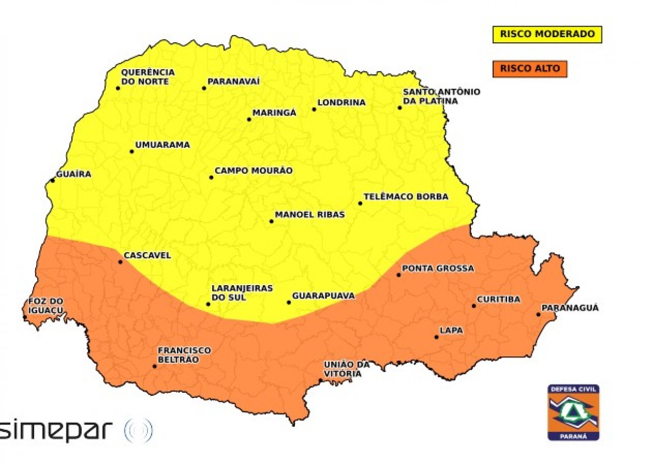 O Simepar alerta para o risco de tempestades pontualmente intensas, com chuva forte em curto espaço de tempo, rajadas de vento mais intensas, descargas elétricas e granizo. Há possibilidade de enxurradas, alagamentos, transbordamento de córregos, destelhamentos, danos em plantações, redução da visibilidade nas estradas e interrupções no fornecimento de energia.