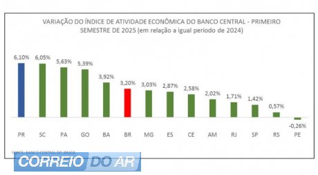 Com um avanço de 6,1% nas atividades econômicas no primeiro semestre de 2025, o Paraná lidera o crescimento econômico anual os estados. O desempenho estadual também é praticamente o dobro do Brasil no mesmo período, cuja variação foi de apenas 3,2%, segundo dados divulgados pelo Banco Central e analisados pelo Instituto Paranaense de Desenvolvimento Econômico e Social (Ipardes).