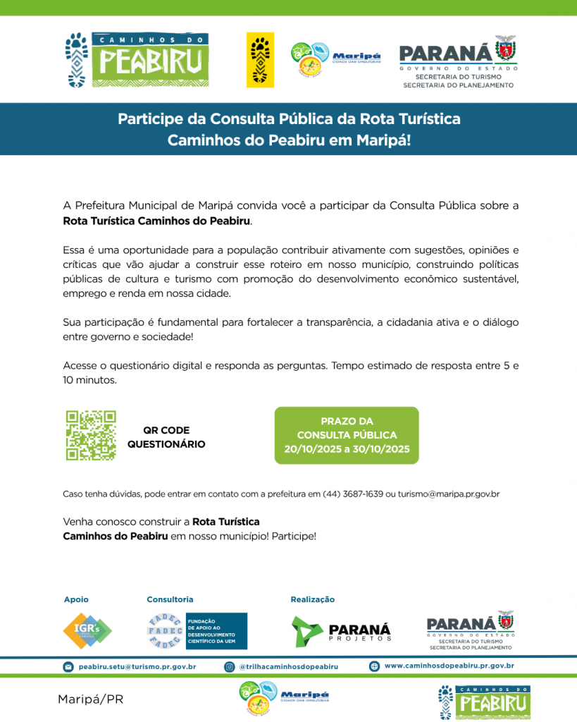 O Governo Municipal de Maripá por meio da Secretaria de Indústria, Comércio, Turismo e Desenvolvimento Econômico está promovendo, entre os dias 20 e 30 de outubro de 2025, a Consulta Pública sobre a Rota Turística Caminhos do Peabiru, convidando toda a população a participar e contribuir com sugestões, opiniões e críticas para a construção coletiva desse importante roteiro turístico.
