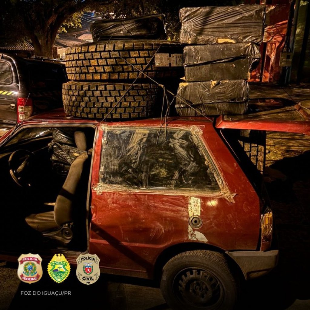 Policiais federais, civis e militares conseguiram apreender um veículo, que transportava cigarros e pneus contrabandeados, durante fiscalização na região marginal do rio Paraná, na madrugada desta terça-feira (10/6), em Foz do Iguaçu.