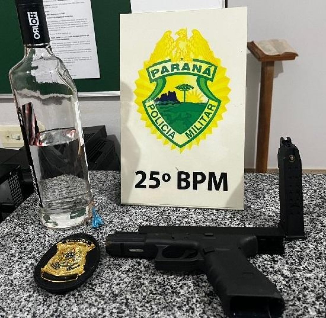 Os policiais encontraram um simulacro de pistola com um carregador, uma garrafa de vodka, uma bucha de cocaína e um distintivo de polícia. O homem foi encaminhado ao Destacamento da Polícia Militar de Brasilândia do Sul e, depois, ao hospital municipal de Iporã.