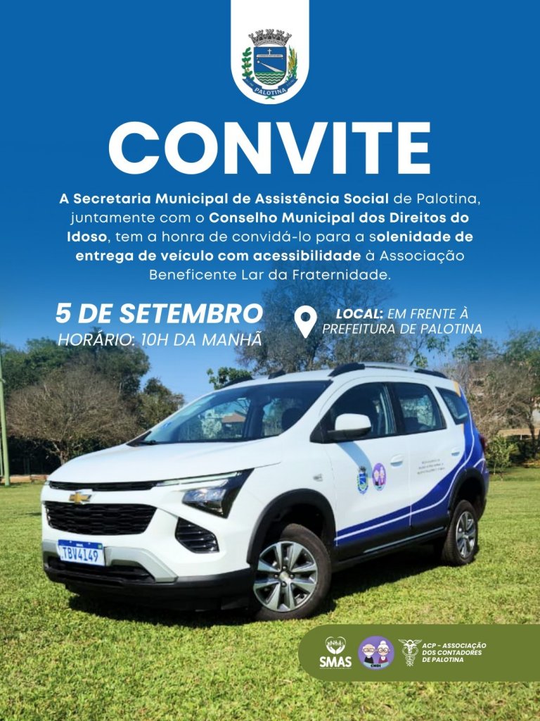 A Prefeitura de Palotina, por meio da Secretaria Municipal de Assistência Social, juntamente com o Conselho Municipal dos Direitos do Idoso, realizará nesta sexta-feira (5), às 10h, a solenidade de entrega de um veículo adaptado à Associação Beneficente Lar da Fraternidade que atende idosos. A cerimônia de repasse do veículo será às 10h.