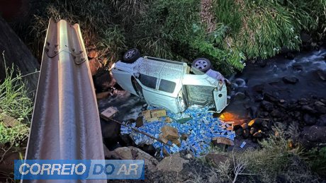Em determinando momento, quando cruzava uma pequena ponte de estrada vicinal que havia adentrado, o veículo saiu da pista, rompendo o parapeito e vindo a cair no rio, abaixo da ponte, espalhando a carga de cigarro, causando ainda dano ambiental e ao patrimônio publico. O condutor evadiu-se na mata fechada adjacente.