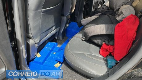 Na vistoria do veículo, que era alugado, os policiais encontraram diversos tabletes de pasta base de cocaína, pesando 33 kg, e maconha, pesando 94,36 kg, distribuídos pelo assoalho e porta-malas. Também foi apreendida uma pistola Glock G17, calibre 9 mm, equipada com kit rajada e três carregadores. A arma estava sem munição.