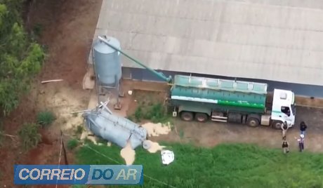 No entanto, o silo não suportou o peso da carga, rompeu a parte de baixo e o produtor rural acabou despencando.