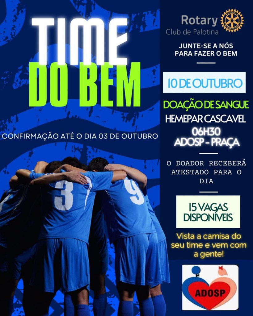 Com o lema “Time do Bem”, a iniciativa busca incentivar voluntários a participarem da campanha. Ao todo, estão disponíveis 15 vagas, e a saída está programada para as 6h30, em frente à ADOSP, na Praça Amadeo Piovesan, em Palotina.